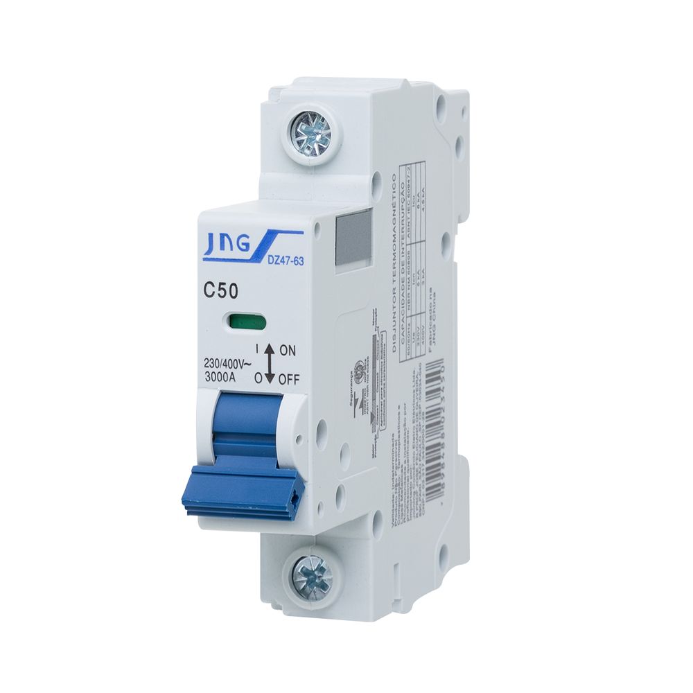 Economia de R$ 1,67O Disjuntor Monopolar da JNG é um dispositivo de proteção de alta capacidade com corrente nominal de 50 Amperes (50A). Projetado para montagem em trilho DIN (Padrão 1P), ele possui a característica de disparo em Curva C, sendo ideal para uso como disjuntor geral secundário ou para a proteção de ramais principais em sistemas monofásicos 127V. Com uma alta capacidade de interrupção de 3kA (3000 Amperes), este minidisjuntor garante a segurança da sua instalação contra sobrecargas e curto-circuitos.