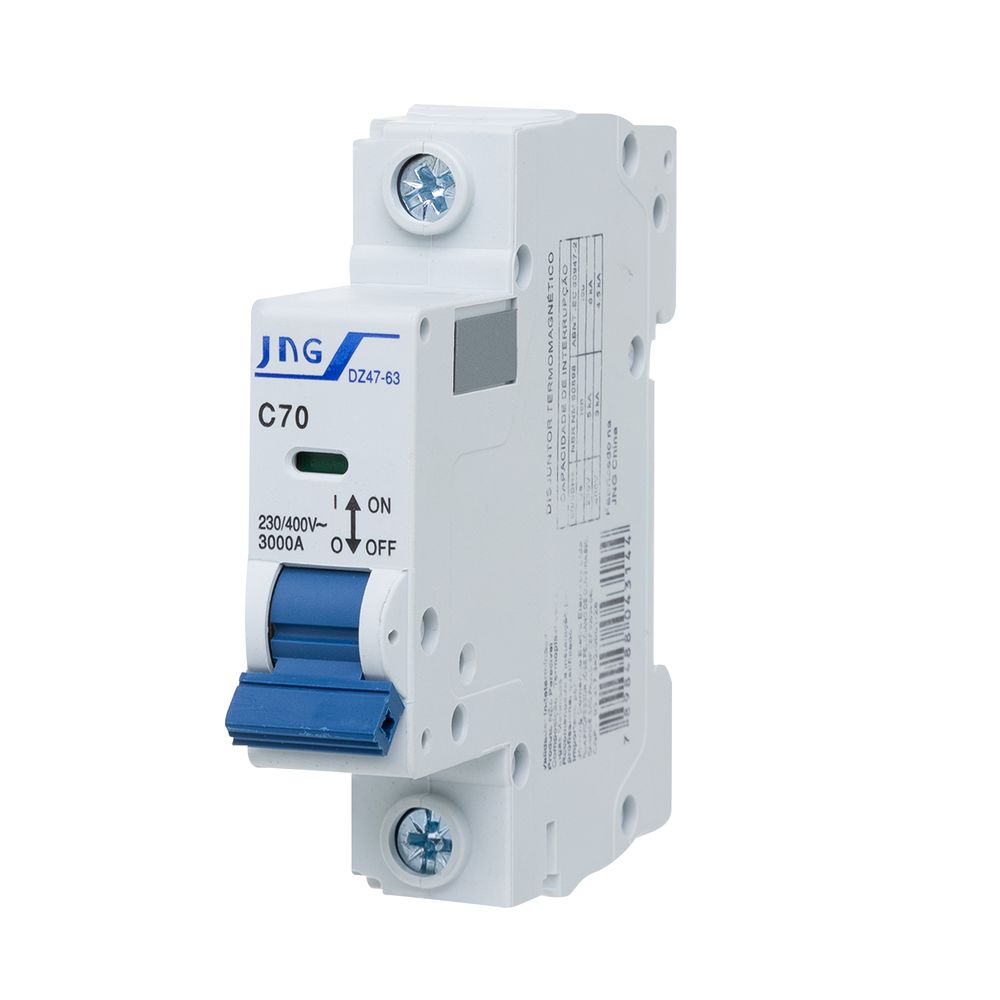 Economia de R$ 2,33O Disjuntor Monopolar da JNG é um dispositivo de proteção de altíssima capacidade com corrente nominal de 70 Amperes (70A). Projetado para montagem em trilho DIN (Padrão 1P), ele possui a característica de disparo em Curva C, sendo adequado para uso como disjuntor geral de alta demanda ou para a proteção de alimentação de grandes equipamentos em 127V. Com uma alta capacidade de interrupção de 3kA (3000 Amperes), este minidisjuntor garante a segurança da sua instalação contra sobrecargas e curto-circuitos.