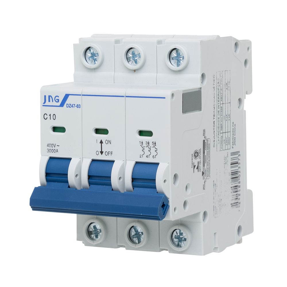 Ideal para a proteção de circuitos elétricos trifásicos. Utilize este disjuntor Tripolar 10A para: Circuitos de Iluminação Industrial, Comandos de Motores de baixa potência e circuitos secundários em geral.