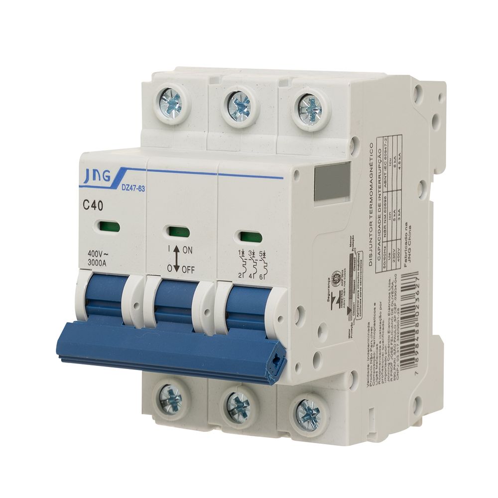 Economia de R$ 9,89O Disjuntor Tripolar da JNG é um dispositivo de proteção de alta capacidade com corrente nominal de 40 Amperes (40A). Projetado para montagem em trilho DIN (Padrão 3P), ele possui a característica de disparo em Curva C, sendo ideal para a proteção de alimentação de painéis de máquinas, sub-quadros e grandes motores em sistemas trifásicos. Com uma capacidade de interrupção de 3kA (3000 Amperes), este minidisjuntor garante a segurança da sua instalação contra sobrecargas e curto-circuitos.