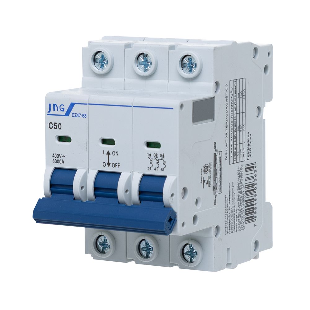 Utilize este disjuntor Tripolar 50A para: Disjuntor Geral Tripolar, Alimentação de Sub-quadros e proteção de circuitos de força principal de alta demanda.