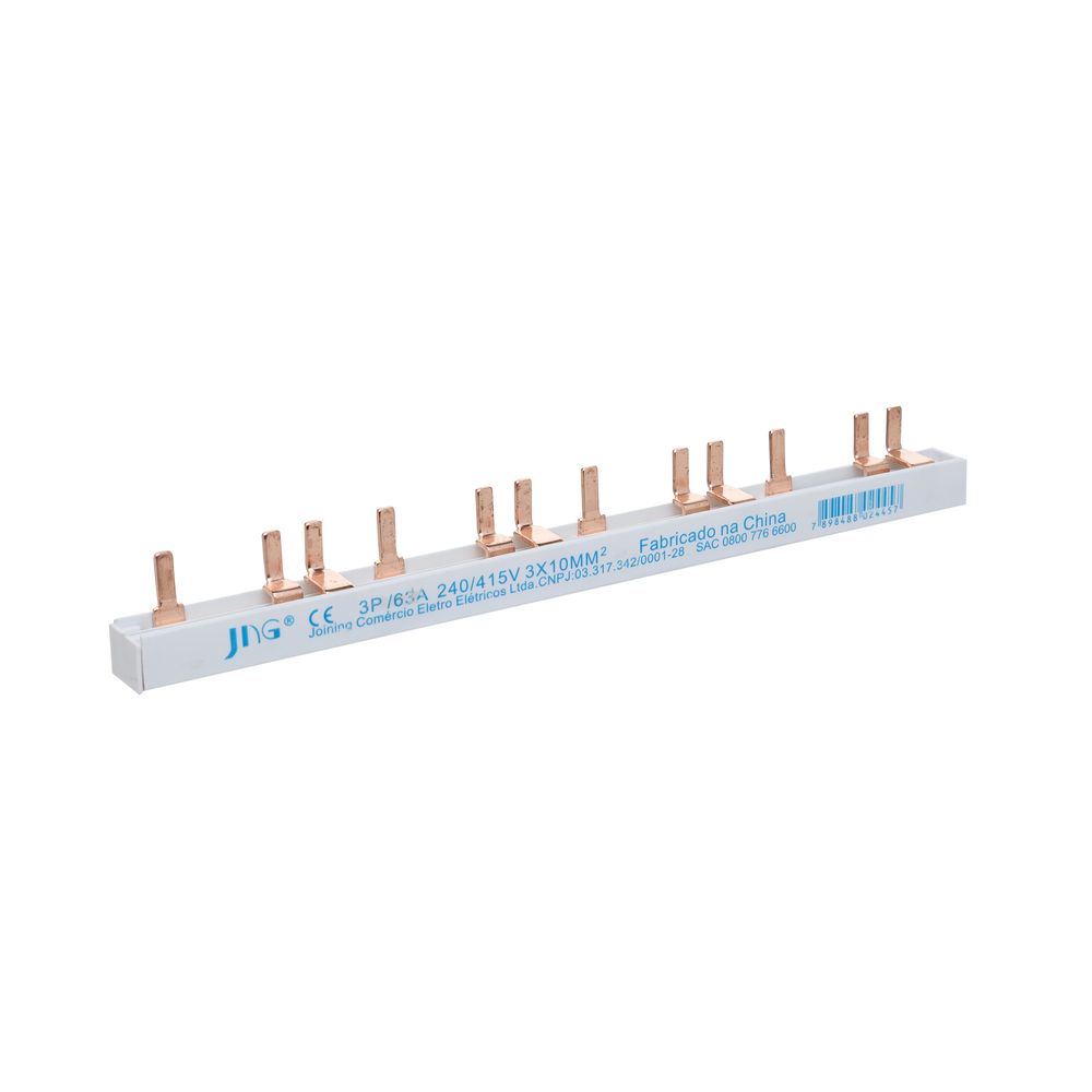 Economia de R$ 6,15O Barramento Pente Trifásico JNG de 12 Polos e corrente nominal de 63A é indispensável para a padronização e a segurança da distribuição de energia em sistemas trifásicos. Este barramento 'Pente' é projetado especificamente para interligar disjuntores em quadros que utilizam as três fases, garantindo que a conexão de energia seja homogênea, robusta e livre de falhas de cabeamento. Com 12 polos, ele permite a conexão rápida de até quatro disjuntores tripolar (ou 12 disjuntores unipolar), oferecendo uma instalação limpa e em conformidade com as exigências técnicas.
