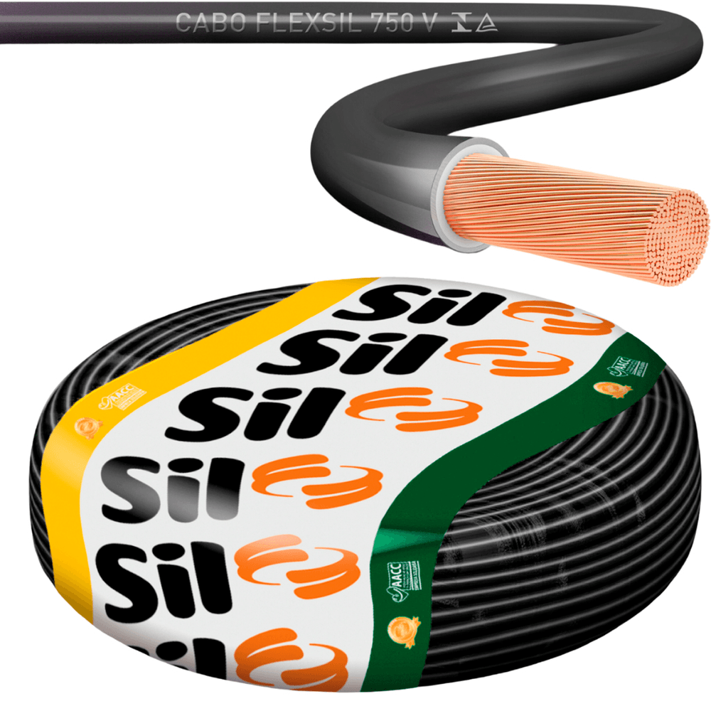 Economia de R$ 116,98O Cabo Flexível da Sil é um condutor de 6mm² na cor Preta, a melhor escolha para o fio de fase em circuitos que demandam máxima capacidade de corrente. Este cabo de 750V tem condutor de cobre nu, têmpera mole, Classe 4, e isolação em PVC 70°C anti-chama. O rolo de 100 metros, certificado pelo INMETRO e em conformidade com a NBR NM 247-3, é indispensável para fiação de chuveiros, cozinhas planejadas e grandes cargas.