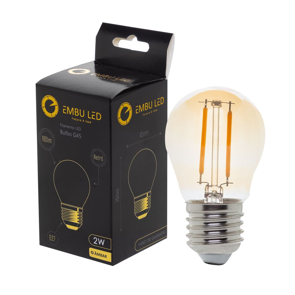Economia de R$ 2,61A LAMP LED FILAMENTO G45 2W 2200K E27 - EMBU LED é uma lâmpada compacta e elegante, ideal para criar um ambiente acolhedor e sofisticado. Com apenas 2W de potência, ela emite uma luz âmbar suave de 2200K, proporcionando uma atmosfera quente e relaxante. Seu formato G45 e o filamento exposto conferem um estilo vintage, perfeito para quem busca aliar funcionalidade e design. A base E27 garante fácil instalação em uma ampla variedade de luminárias.