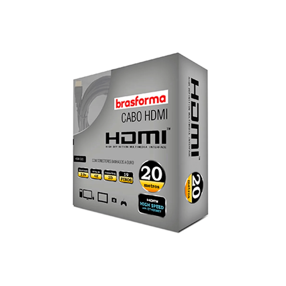 Economia de R$ 40,48O Cabo HDMI 2.0V Brasforma de 20 Metros é projetado para as aplicações mais exigentes que requerem um grande alcance, como sistemas de projeção em auditórios, cinemas ou grandes centros de monitoramento. Este cabo é compatível com a versão 2.0V, o que significa que ele consegue transmitir o sinal 4K Ultra HD (2160p) a 60Hz e imagens 3D com estabilidade mesmo na distância de **20 metros**. Possui 19 pinos (Tipo A) e é a escolha perfeita quando a qualidade de imagem não pode ser comprometida, mesmo em longas metragens.