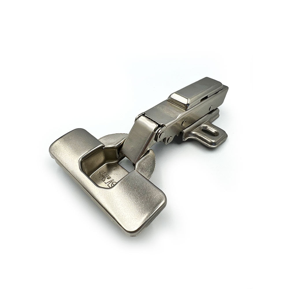 A dobradiça com amortecedor incorporado para fechamento suave de portas. Possui coberturas para corpo e caneco da dobradiça.