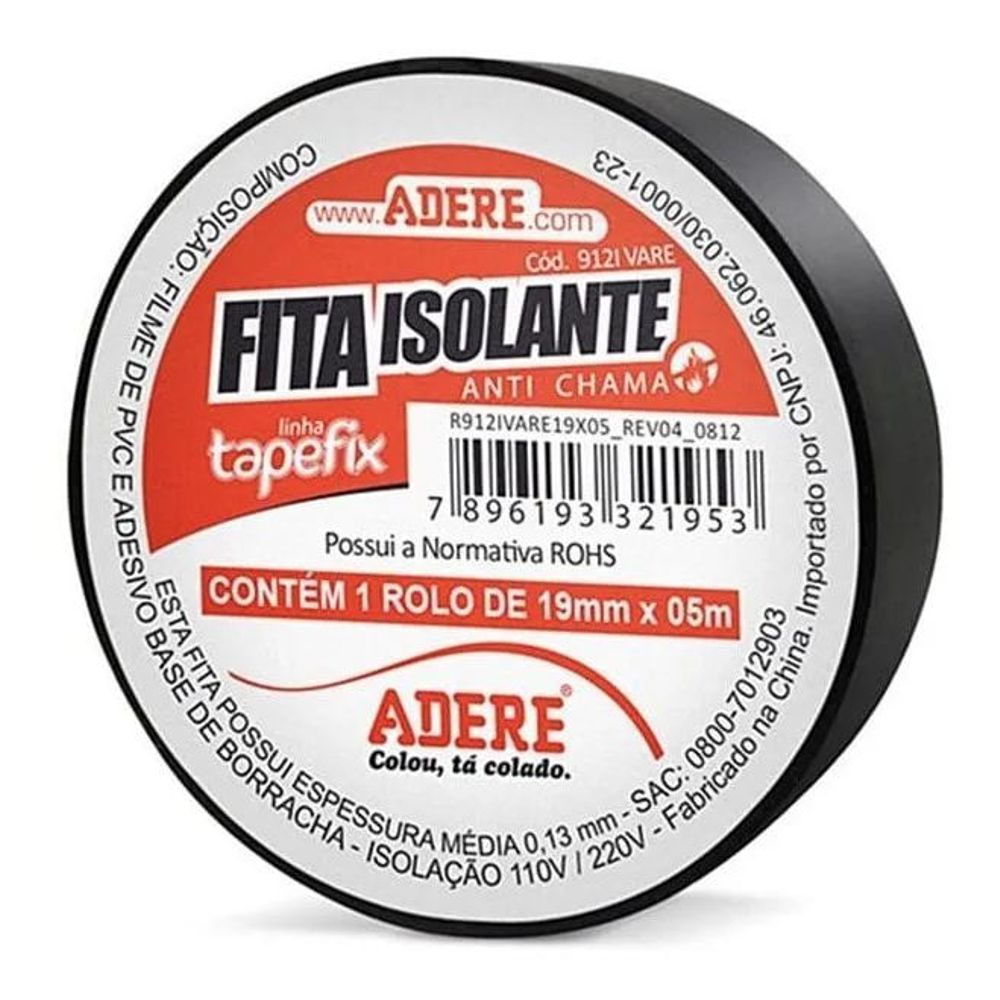 Economia de R$ 1,46A Fita Isolante Adere na cor Preta, com dimensões compactas de 19mm x 5m, é a opção ideal para pequenos reparos, uso em veículos e para ter sempre à mão em caixas de ferramentas portáteis. Fabricada com PVC isolante de qualidade, ela garante a proteção de fios e cabos (até 750V), sendo uma fita segura, flexível e com bom poder de adesão. O rolo de 5 metros é perfeito para quem precisa de uma quantidade menor, evitando desperdício e facilitando o manuseio em locais apertados.