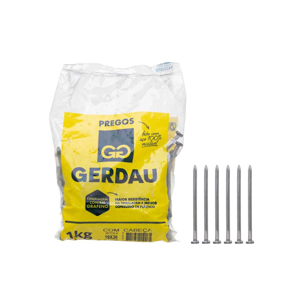 Economia de R$ 2,79Prego de aço 19 x 36 polido com cabeça, da Gerdau, em aço polido. é ideal para fixação em madeira e outros materiais. Pacote com 1kg